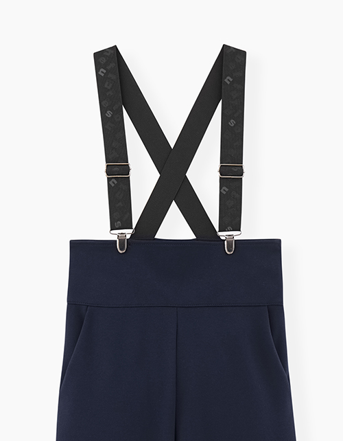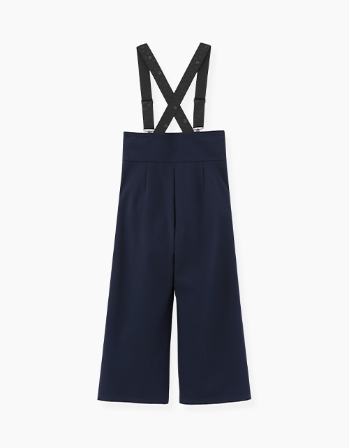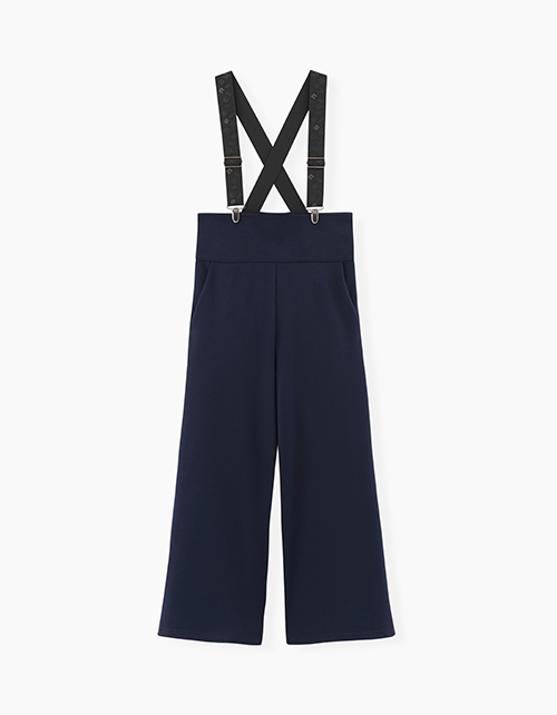 Темно-синие брюки-кюлоты с высокой талией, регулировкой по бретелям. Комфортная модель с наклонными боковыми карманами. Бретели декорированы тематическим буквенным принтом.