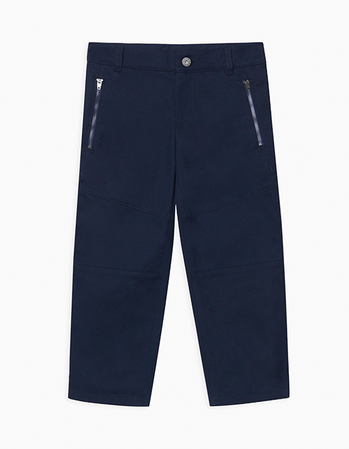 Темно-синие осенние брюки прямого силуэта для мальчика. С четырьмя карманами, застежкой на молнию и болт. Выполнены из темно-синего твила, утеплены флисом. Смещенные боковые швы, кокетка и вытачки под коленями - для удобства и красоты.