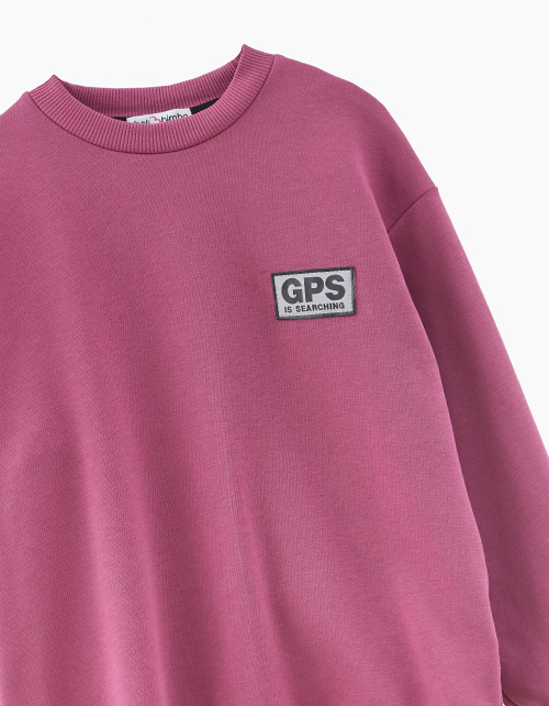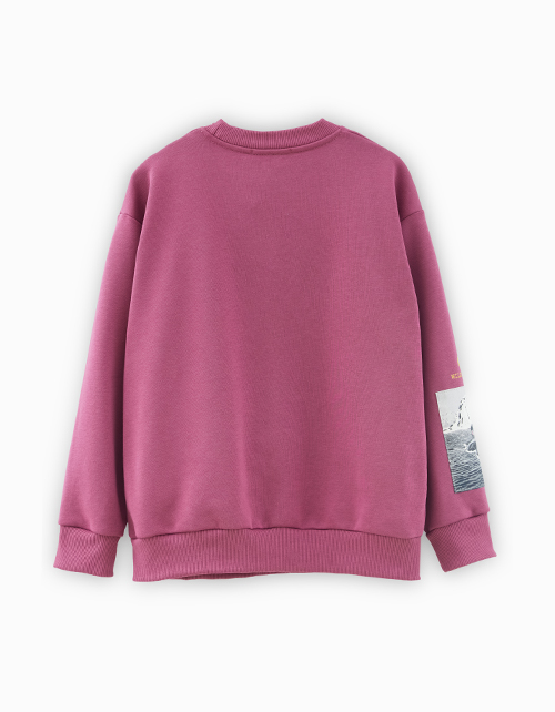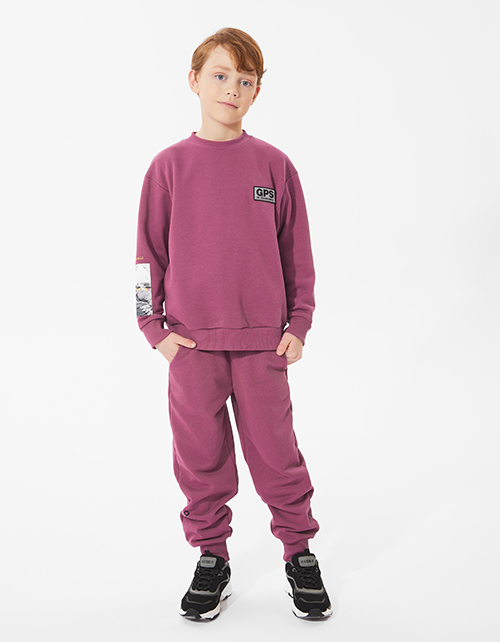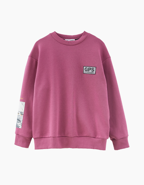 Свитшот в трендовом оттенке "Красная слива" для мальчика. Модель декорирована нашивкой и тематическим принтом.