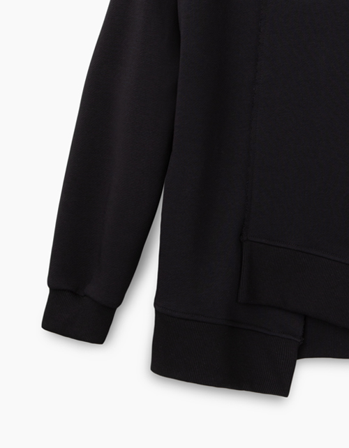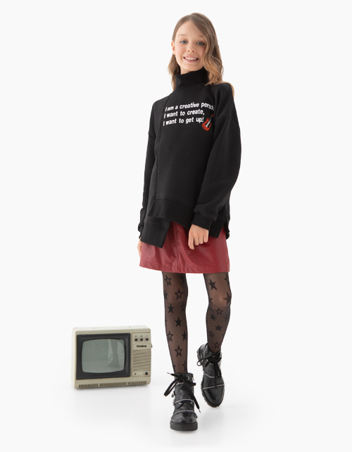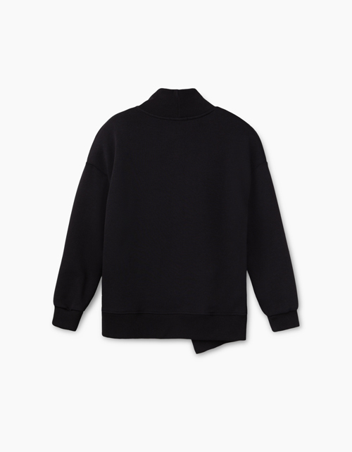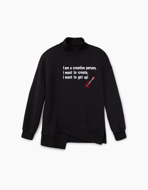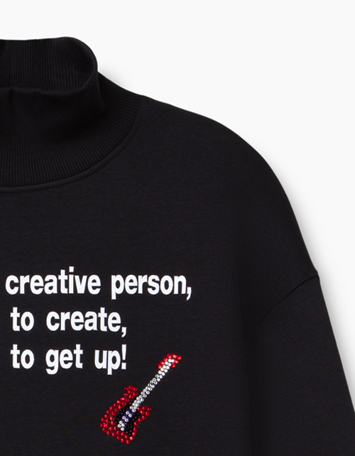 Стильная толстовка с высокой горловиной для девочки. Украшена принтом и аппликацией из страз в форме гитары. Основная ткань - футер, отделка из рибаны. Оригинальный крой с ассиметричным низом и имитацией запаха спереди