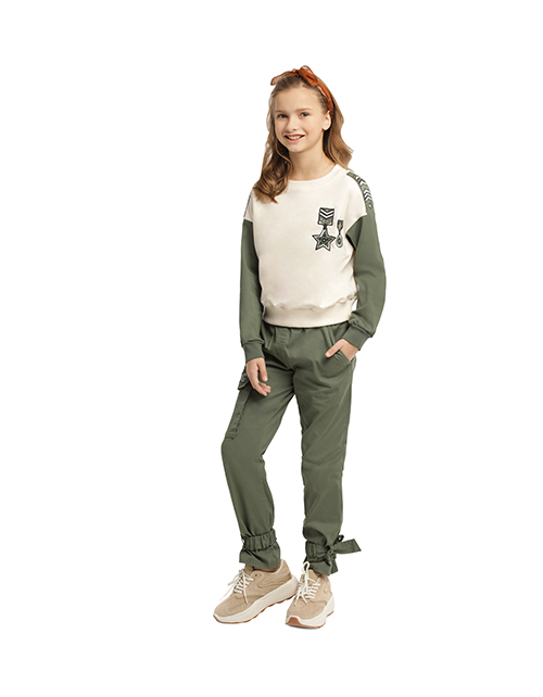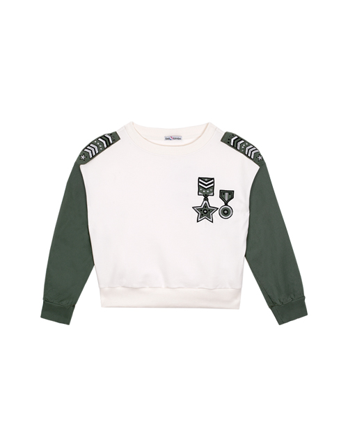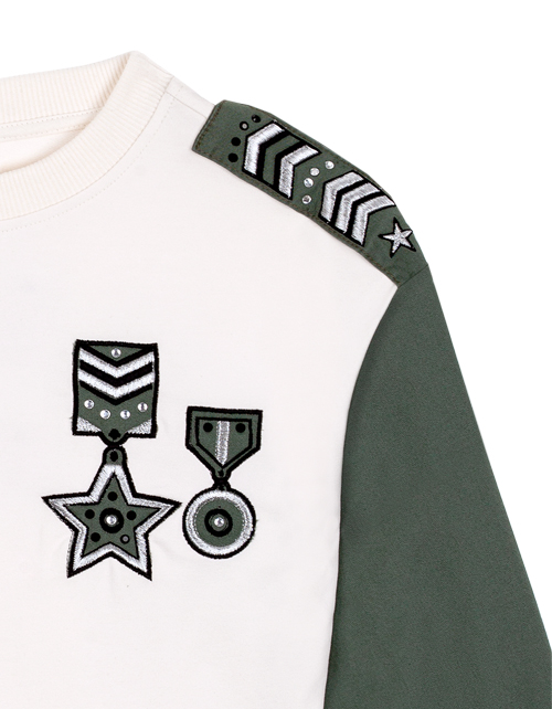 Молочный джемпер для девочки с круглым вырезом горловины. Манжеты и низ из рибаны. Вышивки, стразы и принты в дизайнерской стилистике капсулы "Армия стиля".
