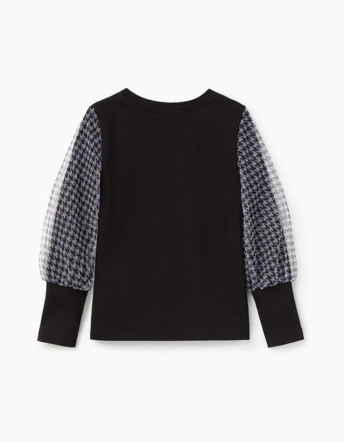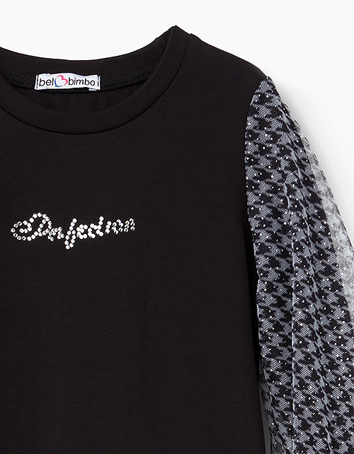 Джемпер полуприлегающего силуэта с декором из страз для девочки. Основная ткань - черная кулирная гладь с начесом. Рукава с высокими манжетами покрыты сверху слоем сетчатого полотна с принтом "гусиная лапка" и блестками