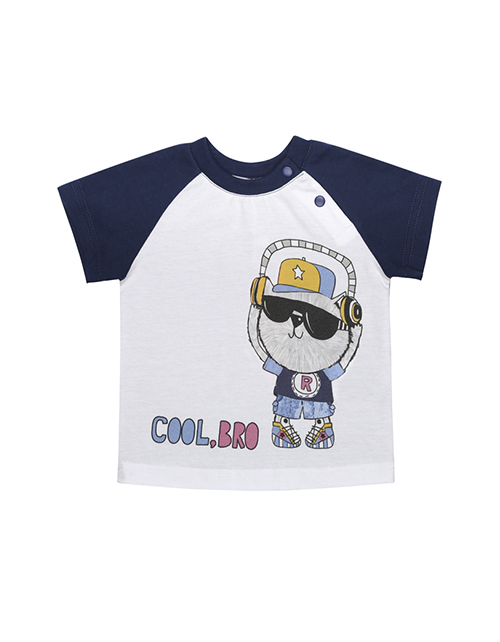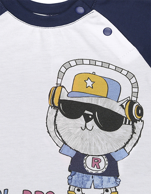 комбинированный джемпер выполнен из кулирной глади,прямого силуэта с коротким руковом покроя-реглан.Застежка у горловины на 2 книппера.Декорирован фотопечатью.