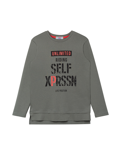Лонгслив в трендовом цвете зелёная агава - изделие из разряда must have. Комфортный материал, свободный силуэт, удлиненная спинка - то, что нужно современному мальчику! Броская яркая надпись на тему самовыражения делает образ актуальным и стильным