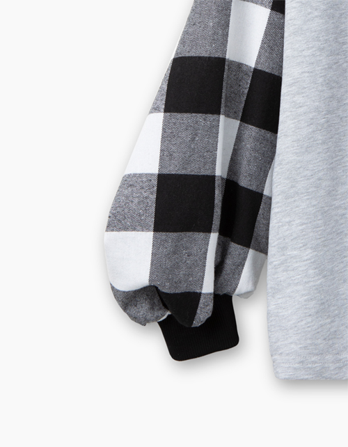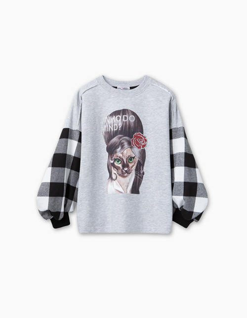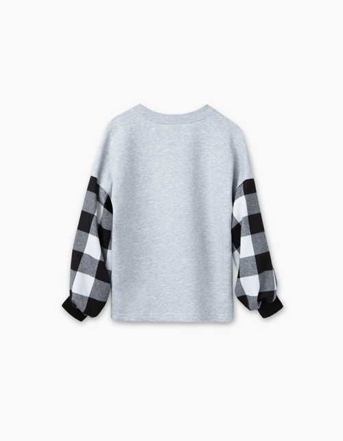 Джемпер свободного силуэта для девочки. Основная ткань - серый меланжевый футер. Объемные рукава из сорочечной фланели в клетку делают модель необычайно стильной. Эффектный принт в стилистике капсулы дополняет образ.