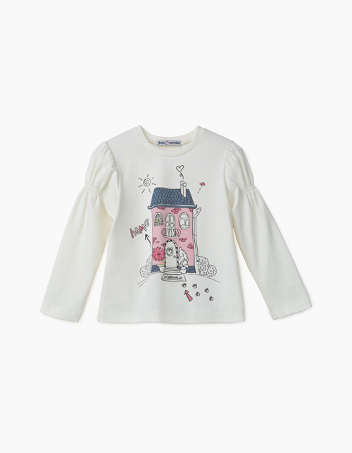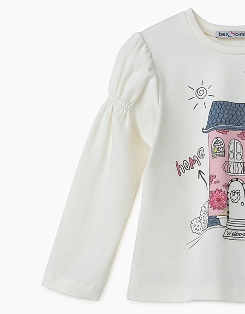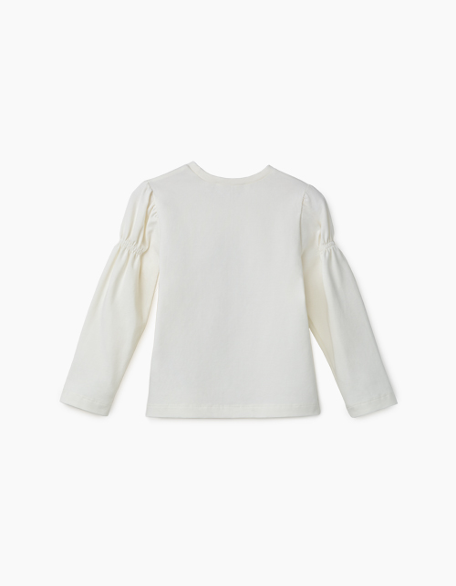Молочный джемпер для девочки. Принт в стилистике капсулы "Пушистая принцесса". Рукава с оборками