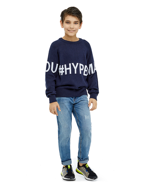 Стильный вязаный джемпер модного денимного цвета отлично дополнит любой casual образ. Комфортный силуэт и надписи в уличном стиле делают его особенно актуальным для современного мальчика. Яркий, модный дизайн делает джемпер запоминающимся и оригинальным