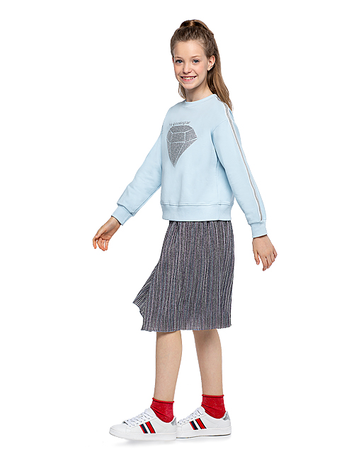 Джемпер для девочки свободного силуэта с круглым вырезом горловины дополнен стильным рисунком в виде алмаза на груди, манжетами и лампасами на рукавах. Трикотажная ткань футер обеспечивает износостойкость изделия и комфорт в носке.