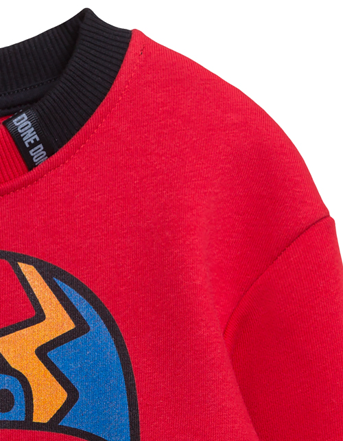 Яркий свитшот украсит гардероб современного мальчика. Мягкий и уютный, комфортной и одновременно модный. Актуальный принт с мультяшным героем команды и комбинированный воротник с нашивкой гармонично дополняют образ.
