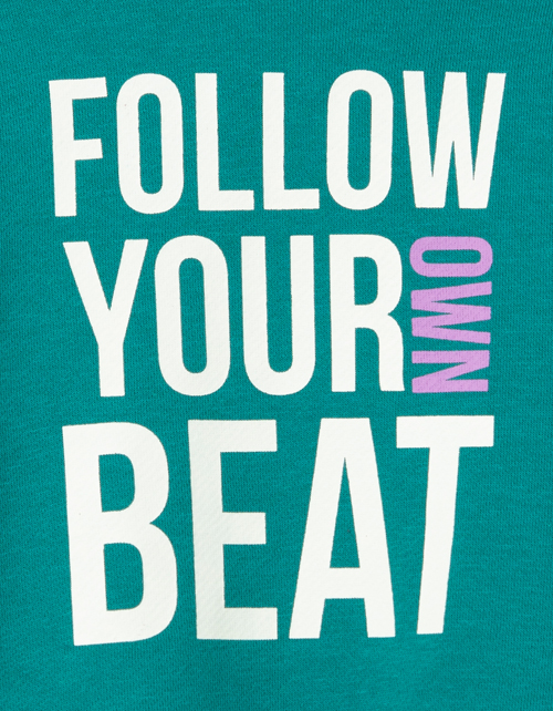 Джемпер свободного силуэта из футера малахитового цвета. Длинный рукав, спущенная линия плеча, воротник-хомут. Низ изделия и манжеты отделаны рибаной. Декорирован вышивкой на киперной тесьме и термотрансферной печатью