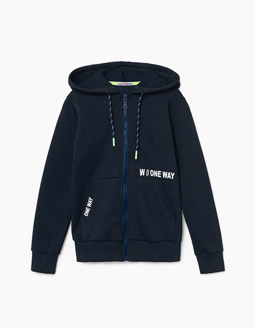 Темно-синее худи прямого силуэта на застежке-молнии для мальчика. Основная ткань - футер, отделка из рибаны. Декорирован текстовыми принтами спереди и сзади: One way ("Односторонний"), Never give up ("Никогда не сдавайся")