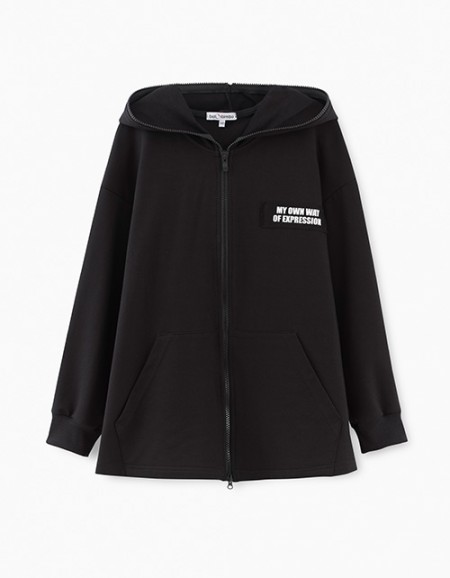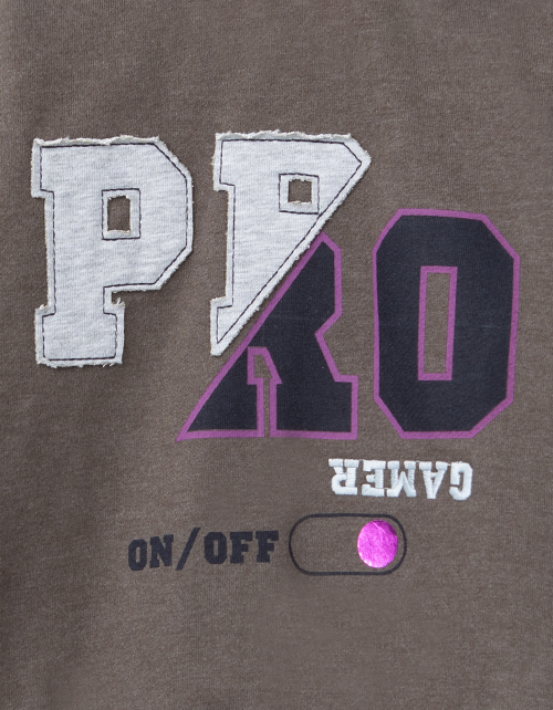 Трикотажный джемпер прямого силуэта с удлиненной спинкой для мальчика. Основная ткань - меланжевый футер цвета хаки. Рукава, горловина и низ изделия спереди отделаны рибаной. Перед декорирован вышивкой и принтом