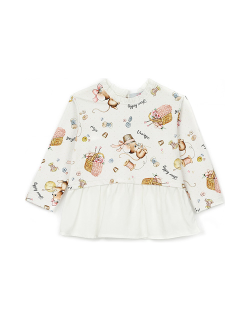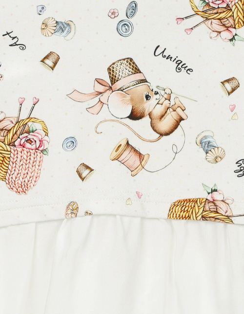 Джемпер для девочки с принтом в виде мышек имеет свободный крой и дополнен баской из плательной вискозы. Круглая горловина джемпера с юбкой украшена сборками, а застежка молния расположена на спинке. Ткань футер дарит приятные тактильные ощущения.