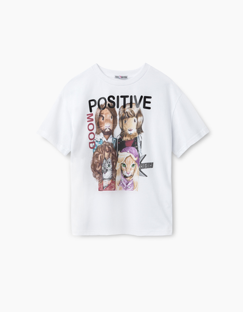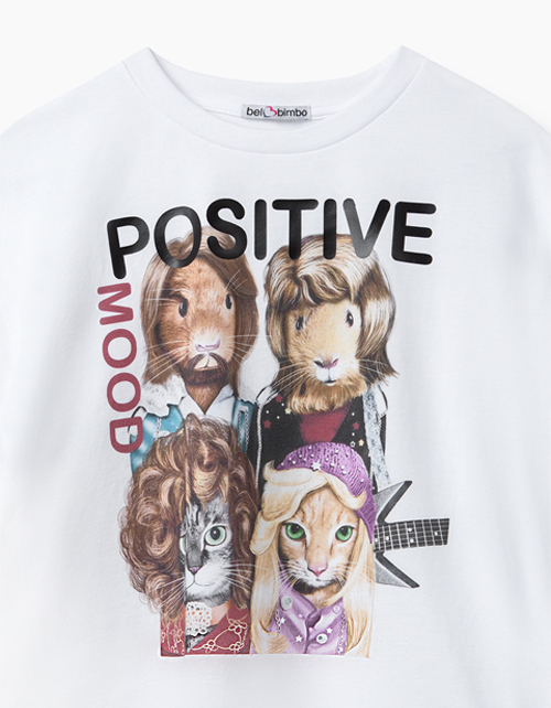 "Белая футболка с ярким принтом для девочки. Удлиненная, свободного силуэта, со спущенным плечом. Спереди нанесено изображение зверей-музыкантов в стилистике коллажа и надпись Positive mood ("Позитивное настроение"). "