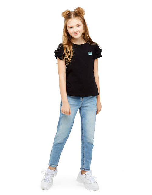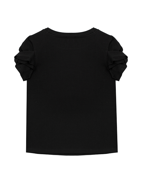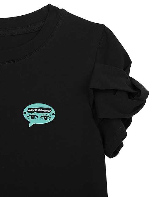 Стильная футболка из мягкой ткани гармонично сочетает в себе безупречный вкус и комфорт. Необычная конструкция рукавов придаёт изделию новизну и актуальность, забавный значок завершает образ и наполняет его индивидуальностью