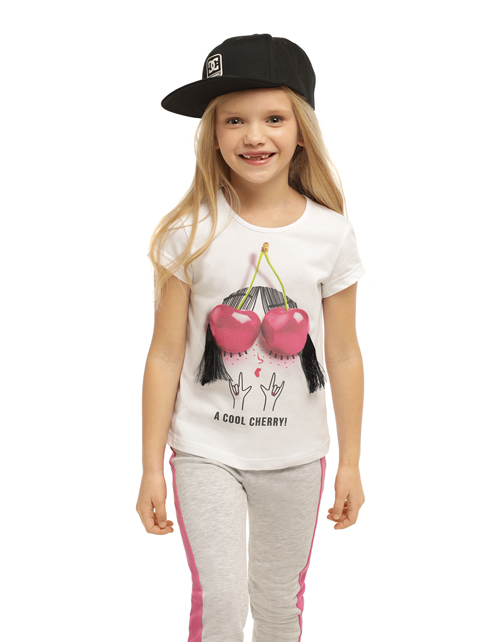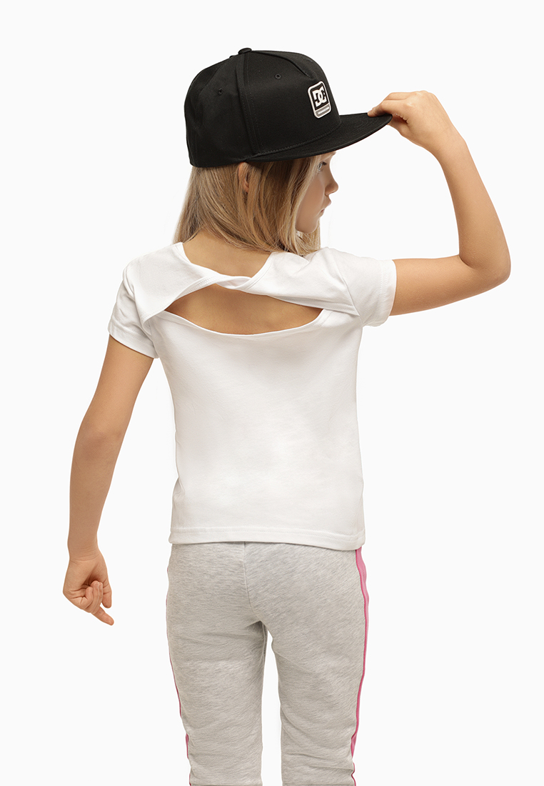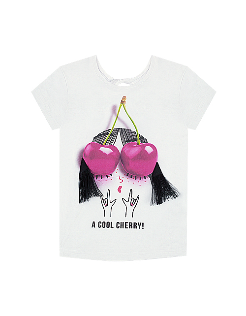 Белая футболка для девочки с круглым вырезом. Дизайнерское оформление в стилистике капсулы "Фруктовый микс". Объемная вышивка на груди. Вырез на спинке.