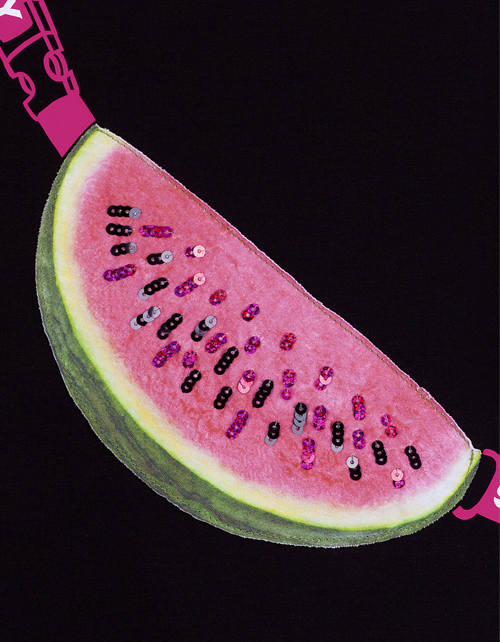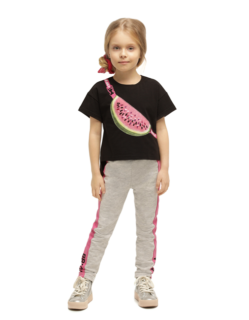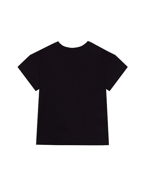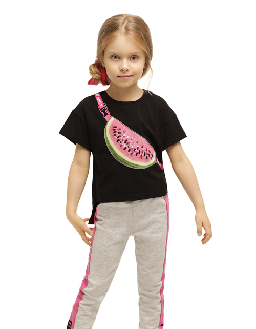 Черная футболка для девочки. Круглый вырез горловины. Дизайнерское оформление в стилистике капсулы "Фруктовый микс". Удлиненная спинка.
