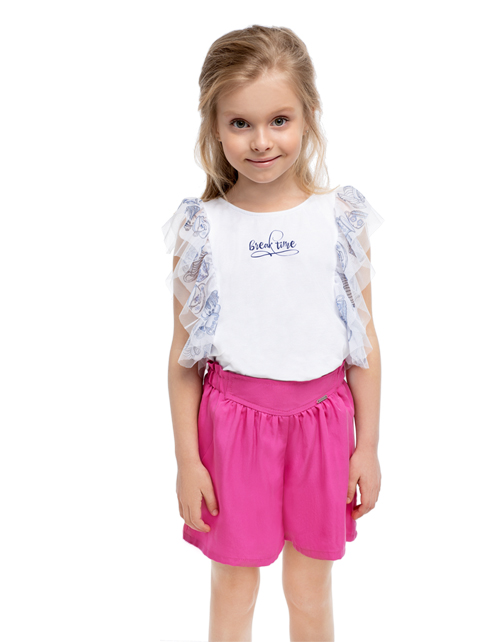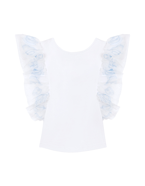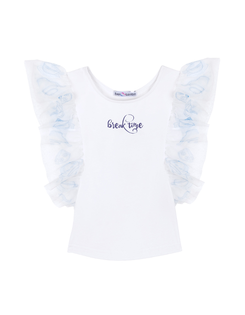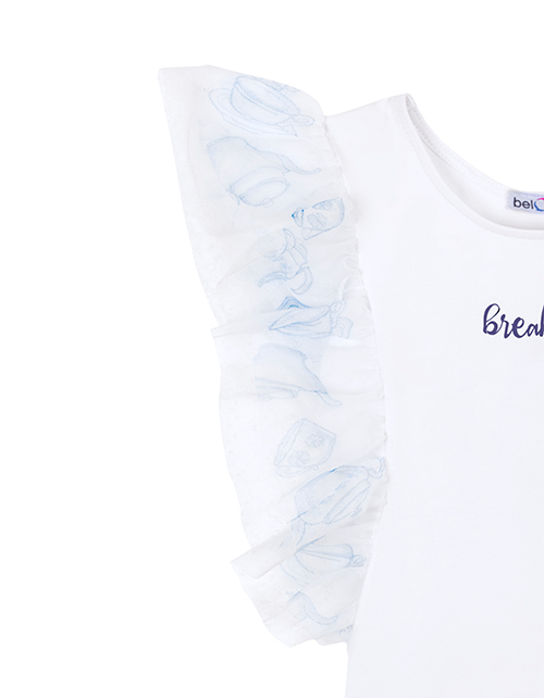 Белая футболка для девочки с круглым вырезом горловины. Рукава с рюшью из сетчатого полотна. Оформление и принт-надпись в стилистике капсулы "Чаепитие в саду".