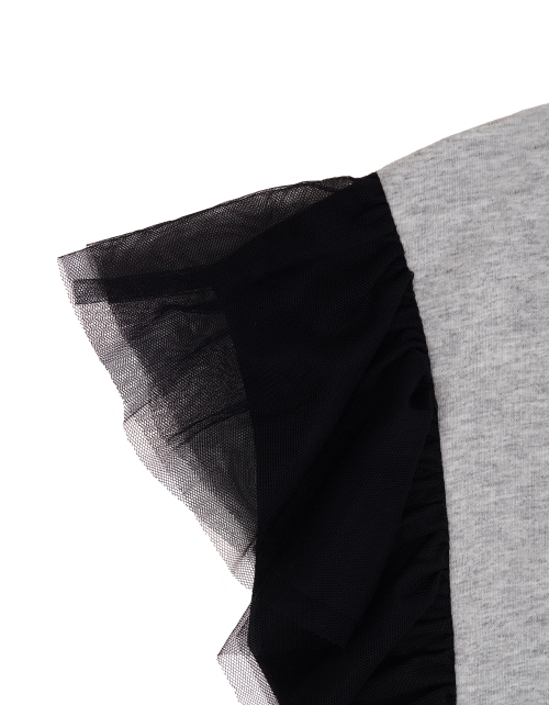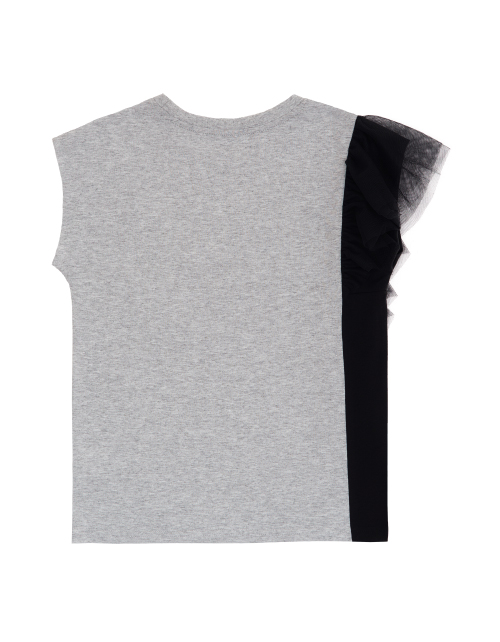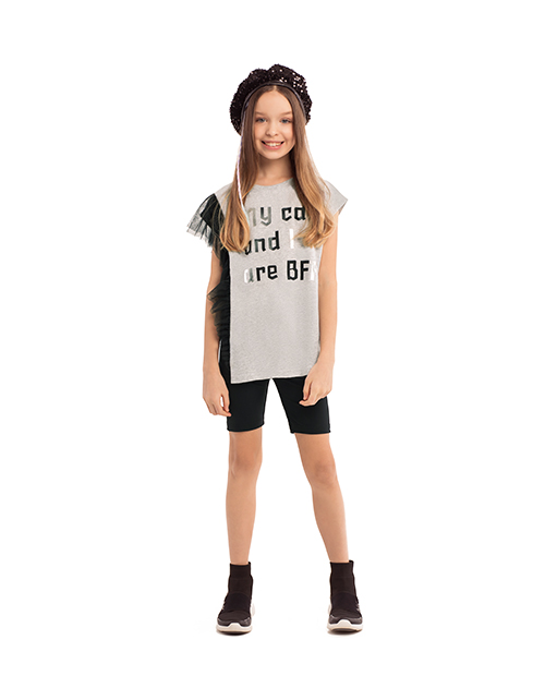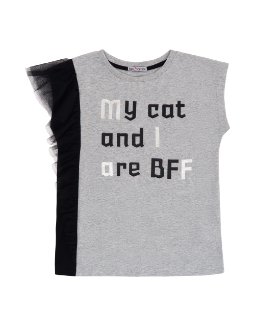 Футбола для девочки с укороченным рукавом и круглым вырезом горловины цвета серый меланж. Декоративная вставка из сетчатого полотна. Принт-надпись в стилистике капсулы "Кот-Арт".