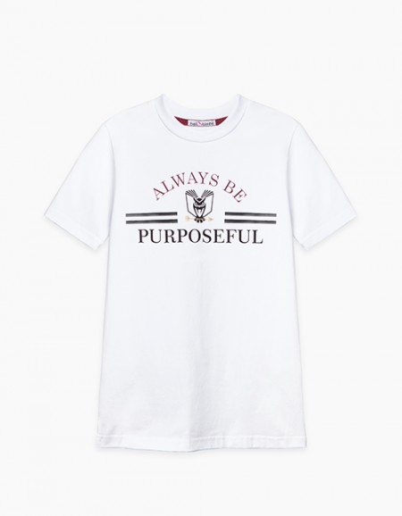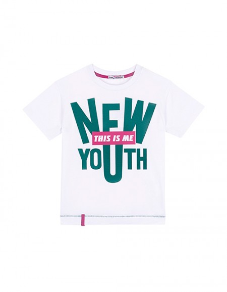 Повседневная белая футболка для девочки прямого силуэта. Короткие рукава и круглый вырез горловины. Футболка имеет отделку из плательной ткани и дополнена воланом на спинке и стильным принтом.