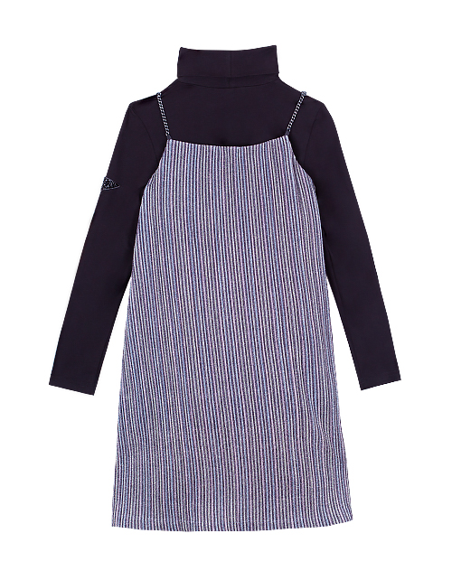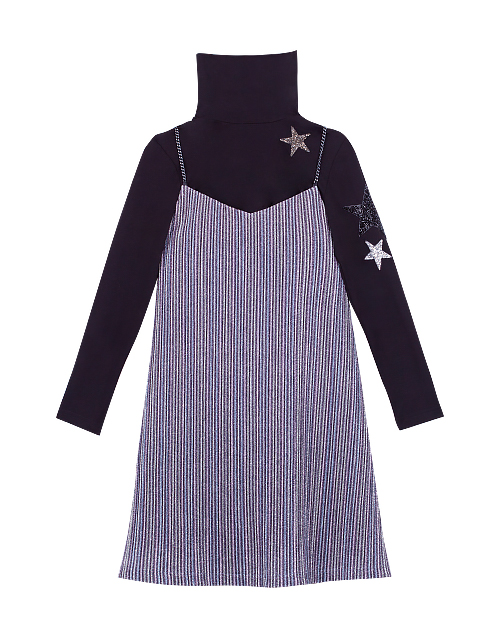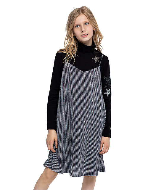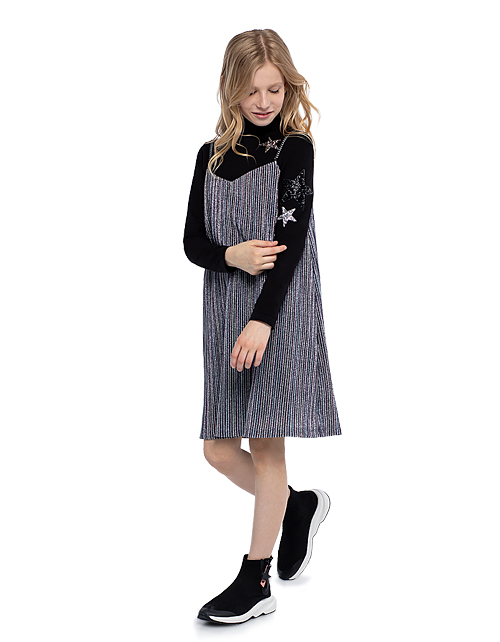 Нарядный комплект для девочки состоит из джемпера и сарафана. Джемпер из трикотажной ткани кулирная гладь дополнен высоким воротником и принтом со звездами. Сарафан из трикотажного полотна плиссе имеет подкладку из вискозы для комфортной носки.