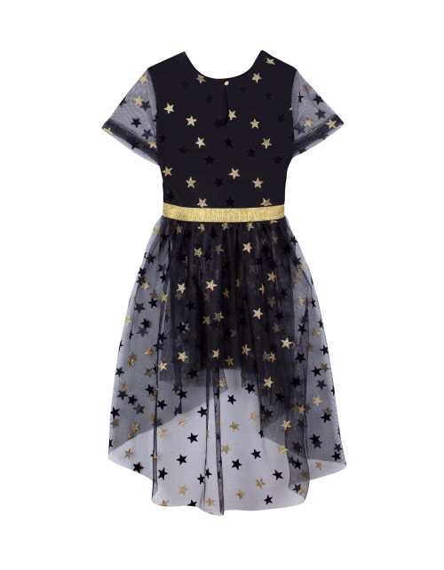 Нарядный комплект включает в себя платье для девочки и шорты. Платье с коротким рукавом и круглым вырезом горловины имеет отделку сетчатым полотном со звездами с блестками. Застежка на пуговице на спинке. Шорты на резинке.