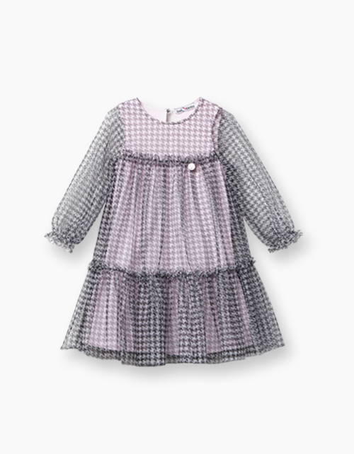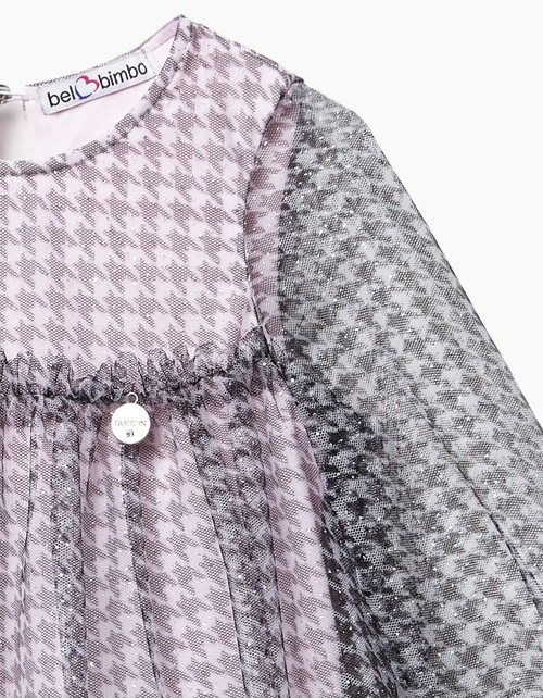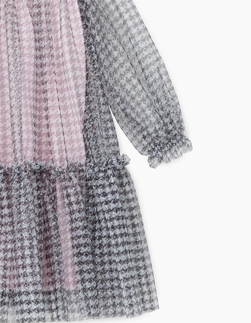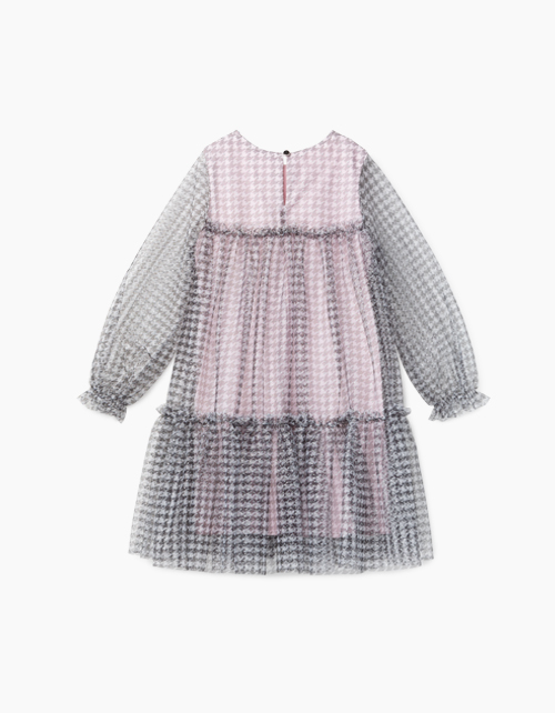 Нарядное платье-трапеция из сетчатого полотна на подкладке из светло-розовой кулирной глади. Маленькая рюша по низу рукава собрана на резиновую нить. Декоративный принт из серебряной фольги спереди. Застежка на пуговицу