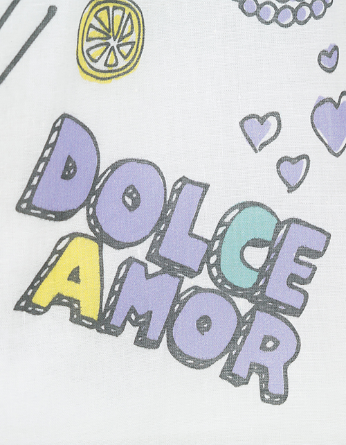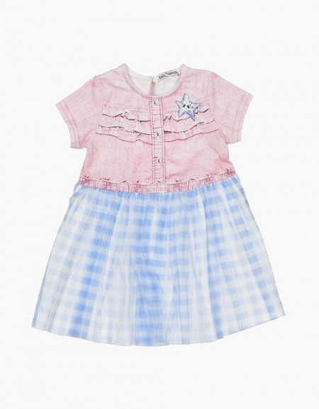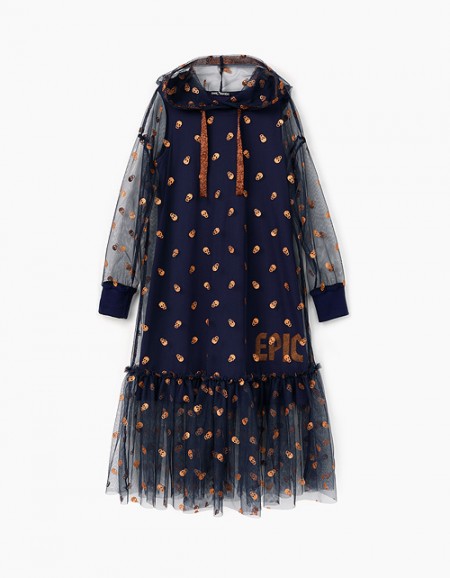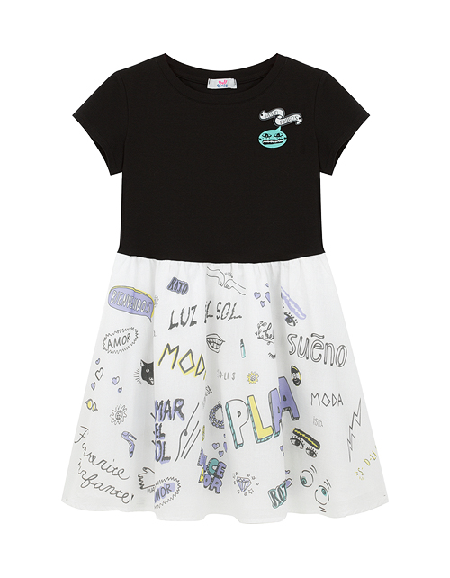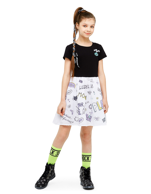 Эффектность романтичного платья основана на контрасте фактур и цвета. Сочетание тёмного верха и воздушной юбки, декорированной интересным принтом, имитирующим граффити, делает платье ярким и запоминающимся! Забавные значки придают модели озорное настроени