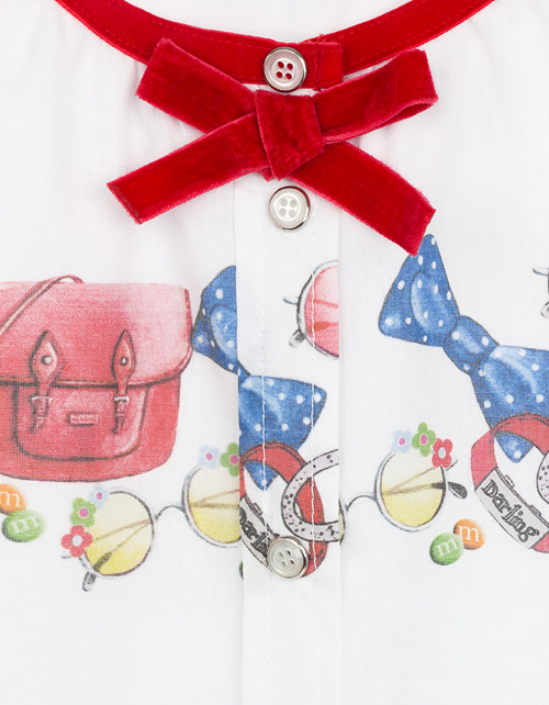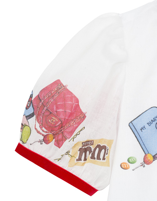 Милое платье понравится юной любительнице шопинга! Как классно смотрятся изображенные на модели разноцветные вещички, наполняя образ детской непосредственностью. Игривые милые рюши и отделка контрастной яркой лентой с бантиком усиливают это впечатление