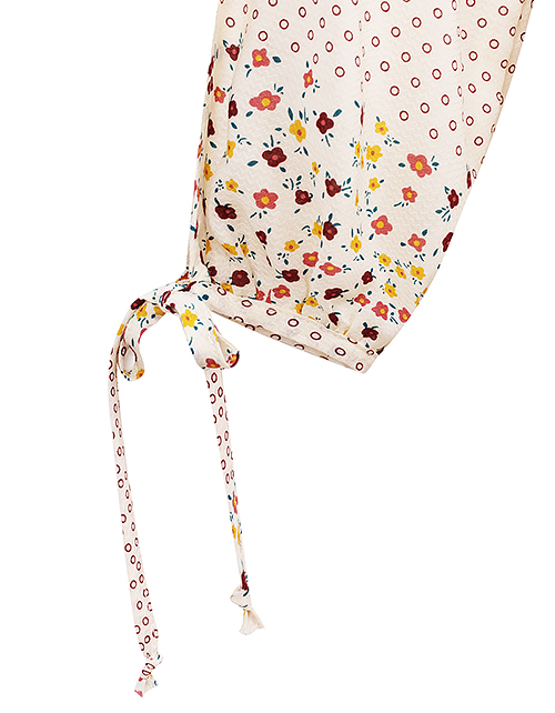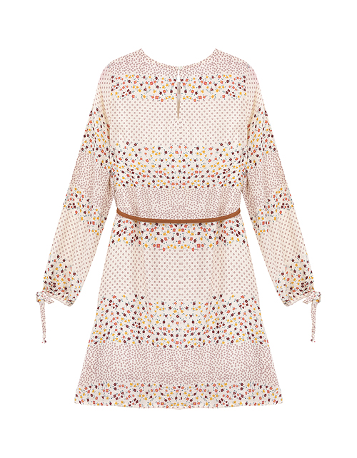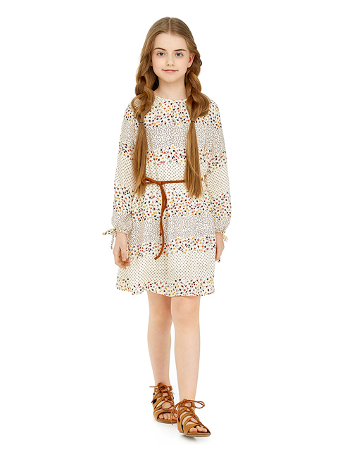 Легкое струящееся платье А-образного силуэта прекрасно подойдет для жаркой погоды и подарит девочке прекрасное настроение! Тактичный принт дополняет изящный пояс из мягкой замши, подчёркивающий талию, и милые завязки на рукавах, придающие образу романтичн