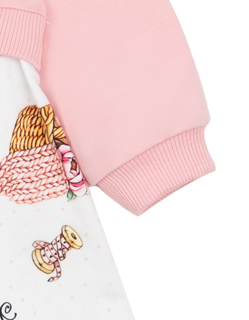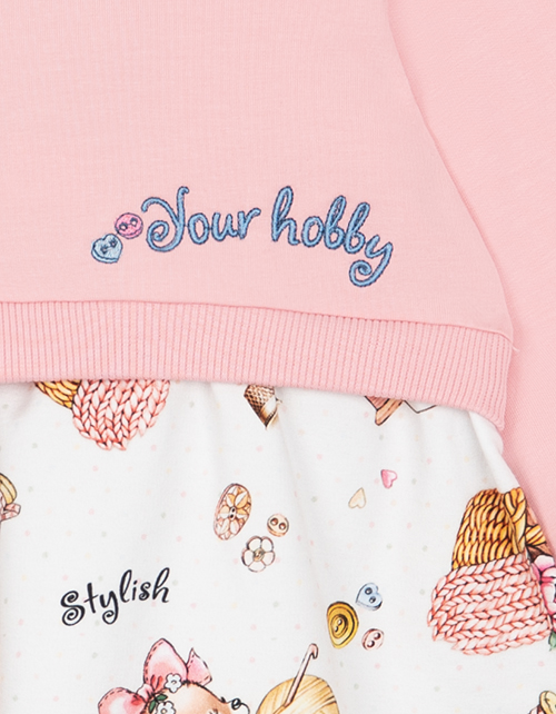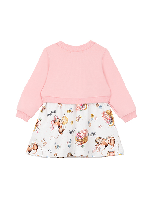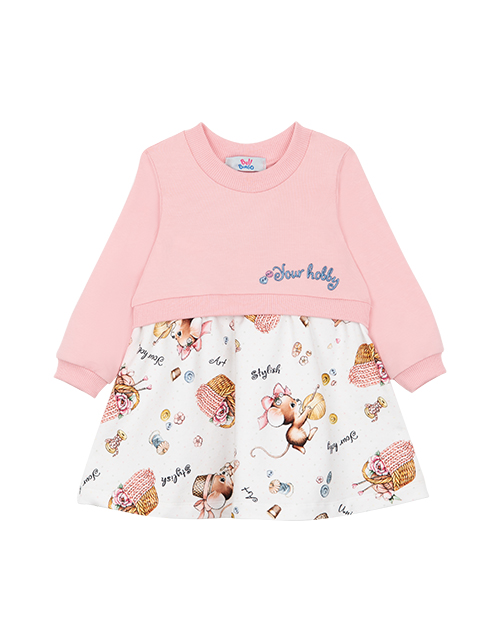 Розовое платье для девочки свободного силуэта в нежных тонах дополнено манжетами на рукавах, круглым вырезом горловины и вышивкой на груди. Отрезная юбка имеет стильный принт с мышками. Трикотажная ткань футер гарантирует приятные тактильные ощущения.