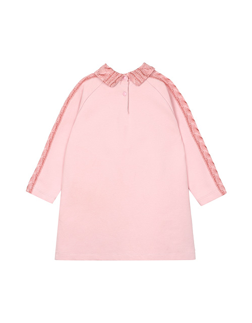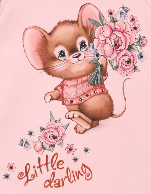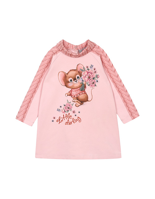 Розовое платье для девочки с рисунком в виде мышки с цветами имеет свободный силуэт, длинные рукава и высокий воротник. Изделие украшено вставками с принтом в виде крупной вязки. Ткань футер гарантирует приятные тактильные ощущения.