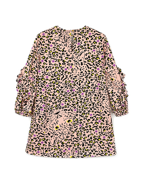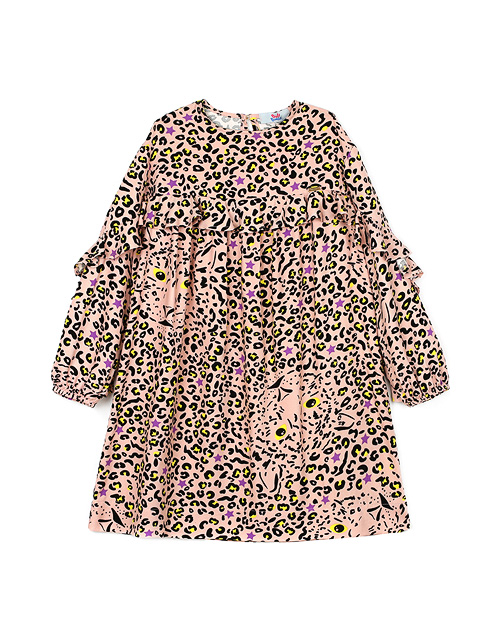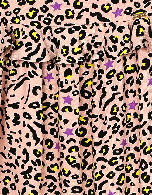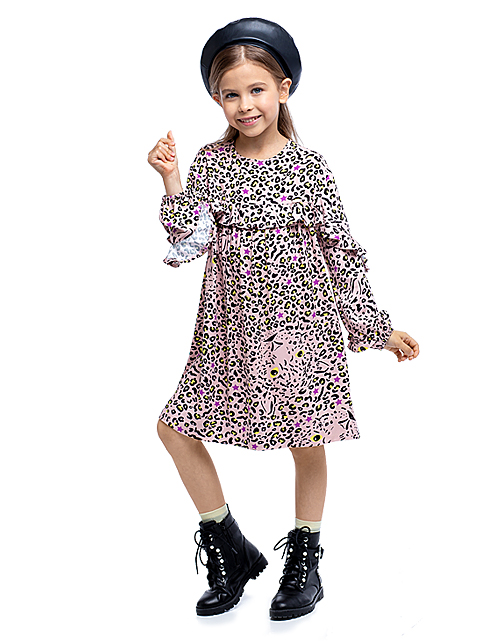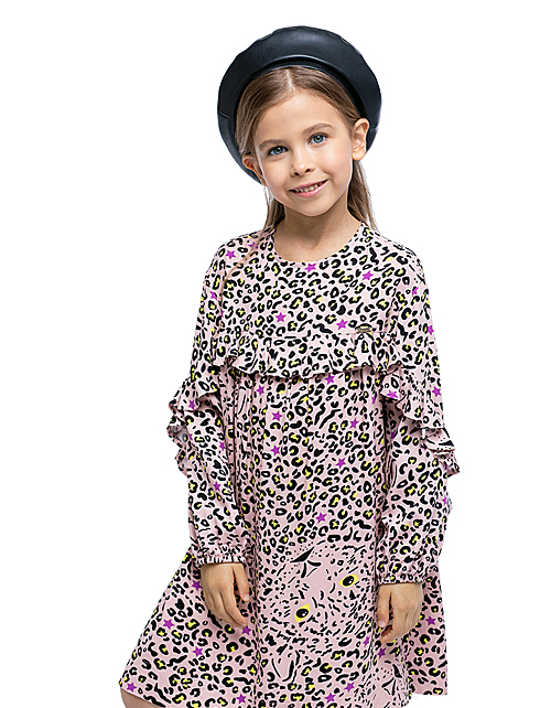 Платье для девочки а-силуэта с принтом имеет круглый вырез горловины, застежку на пуговицу, резинку на рукавах и украшено оборками. Ткань плательная вискоза гарантирует приятные тактильные ощущения и комфорт в носке.