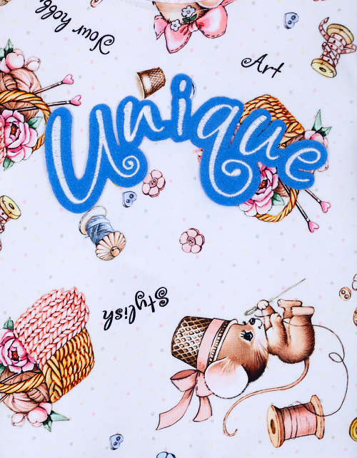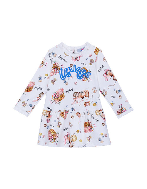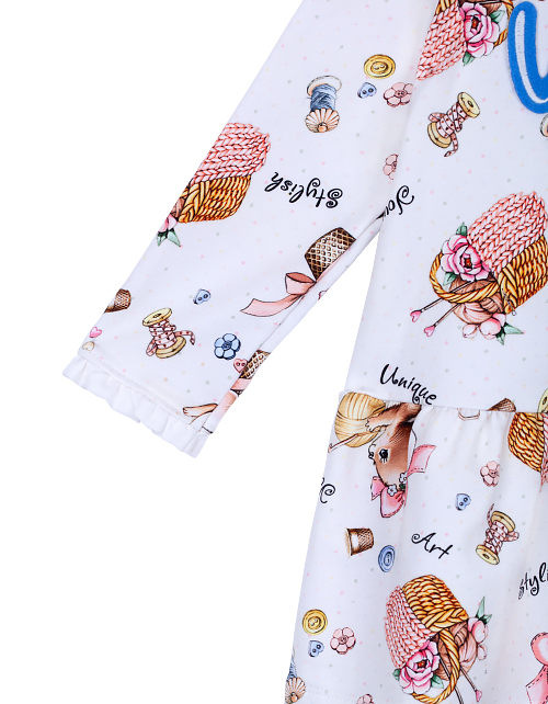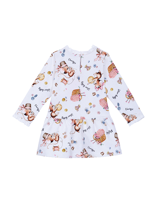 Платье для девочки с принтом свободного силуэта имеет заниженную линию талии, длинный рукав и круглый вырез горловины. Рукава и воротник изделия украшены кружевом. Трикотажная ткань футер гарантирует износостойкость и приятные тактильные ощущения.