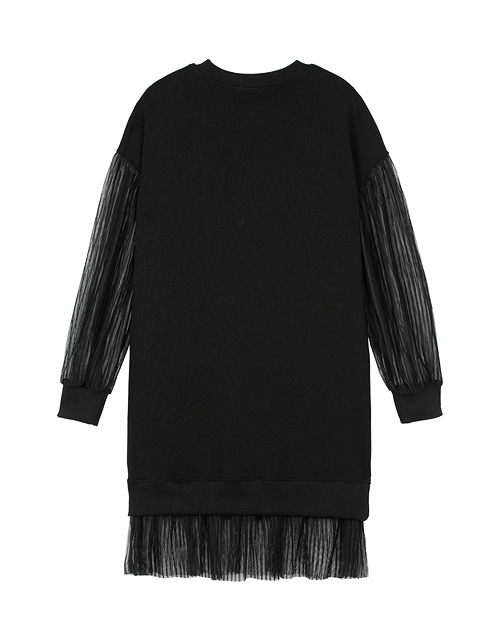 Платье для девочки прямого силуэта с круглым вырезом горловины и манжетами на рукавах дополнено принтом в виде надписей и имитацией подвески на груди. Рукава и низ изделия имеют отделку сетчатой тканью с пайетками. Ткань футер гарантирует комфорт в носке.