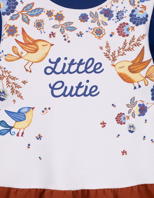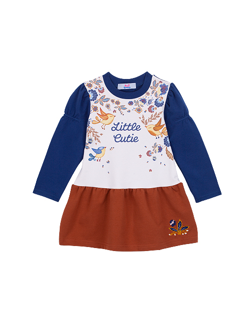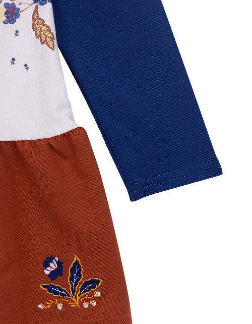 Платье для девочки с юбкой дополнено растительным принтом с птичками, стильной надписью и вышивкой на юбке. Изделие имеет длинный рукав, заниженную отрезную талию и круглый вырез горловины. Ткань футер дарит повышенный комфорт и удобство в носке.