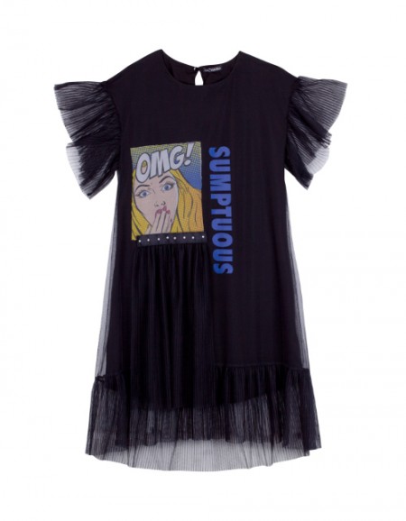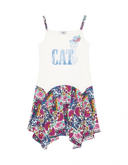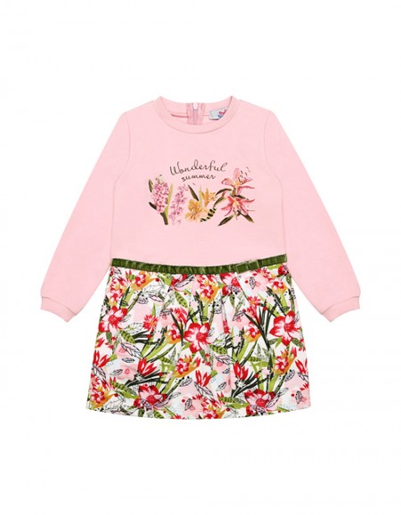 Платье для девочки имеет эффект многослойности за счет контрастного цвета рукавов и отделки горловины и проймы. Растительный принт есть на верхней части платья и рукавах, а два накладных кармана украшены вышивкой. Ткань футер мягкая и приятная на ощупь.