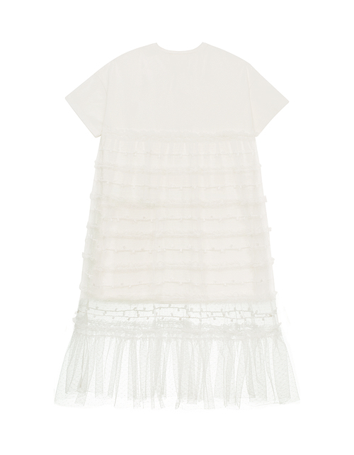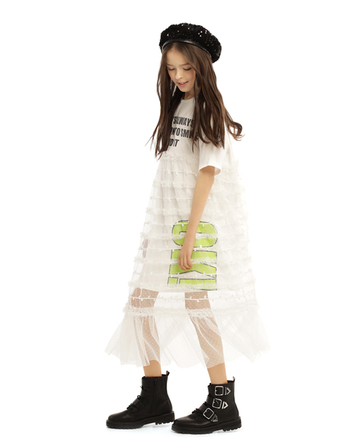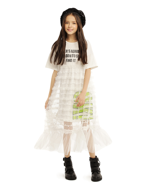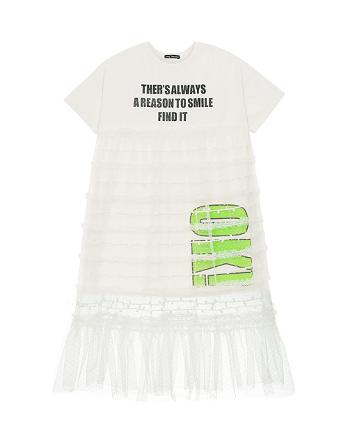 Молочное платье для девочки удлиненной конструкции с завышенной талией. Удлиненная майка oversize-силуэта и юбка из сетчатого полотна в рюши. Короткий рукав, круглый вырез горловины. Принты в стилистике капсулы "Event".