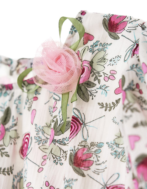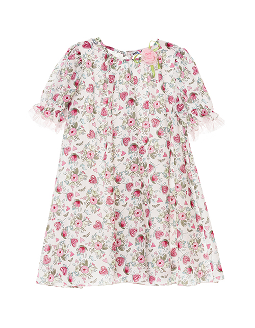 Набивное платье для девочки трапециевидного силуэта. Удлиненное, свободный крой. Рукав-фонарик с оборками. Застежка на спинке на пуговицу. Дизайнерское оформление в стилистике капсулы "Незабудка".