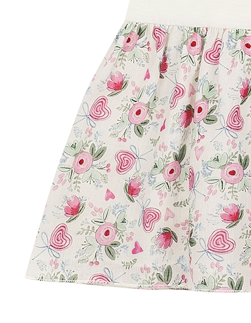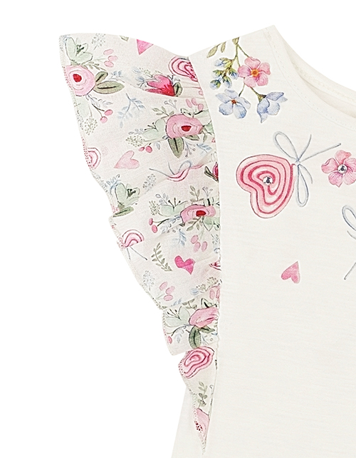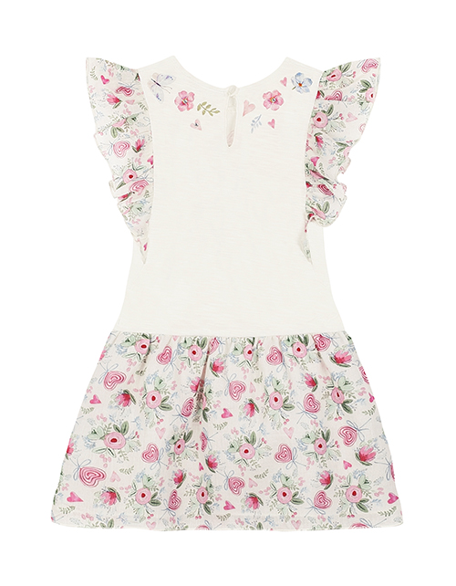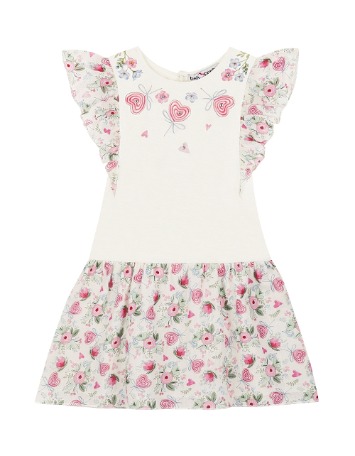 Набивное платье для девочки полуприлегающего силуэта. Рукав с оборками в виде удлиненного крылышка. Застежка на спинке на пуговицу. Дизайнерское оформление в стилистике капсулы "Незабудка".