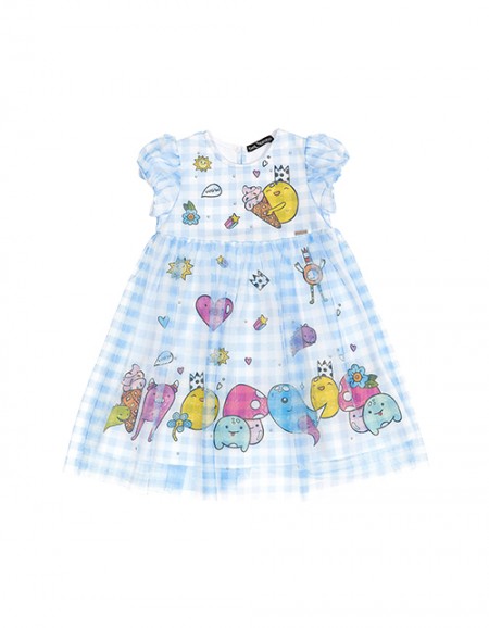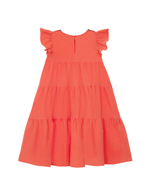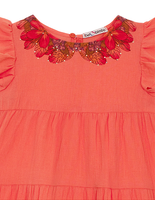 Коралловое платье для девочки. Удлиненная модель трапециевидного силуэта. Застежка на пуговицу на спинке. Декорировано нашивками, сеточкой и пайетками. Оформление в стилистике капсулы "Цветочное сафари".