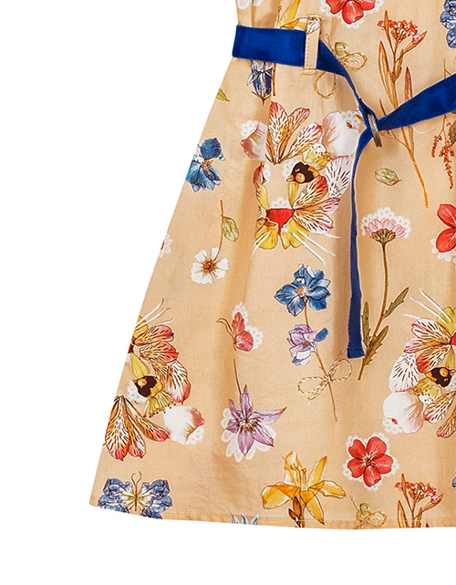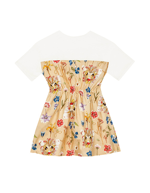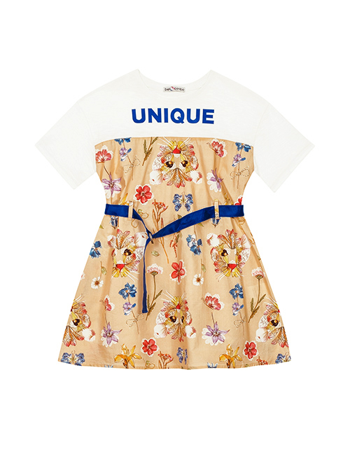 Набивное платье для девочки свободного силуэта со спущенным спортивным рукавом. Декорировано рюшей, трансферной пленкой и функциональным затягивающимся ремешком с двумя полукольцами. Оформление в стилистике капсулы "Цветочное сафари".