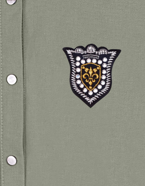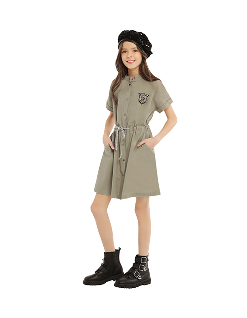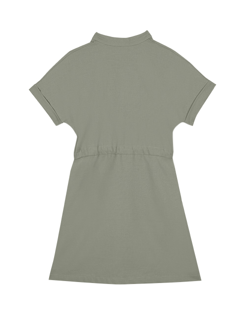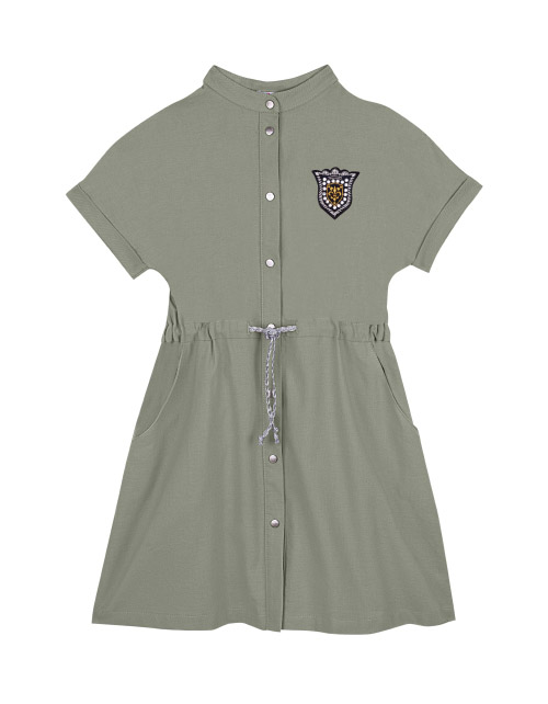 Платье для девочки цвета олива. Застежка конструкции турникетная кнопка. Нашивка в стилистике капсулы "Армия стиля". Закрытый шнурок на поясе. Короткий рукав с подворотами.