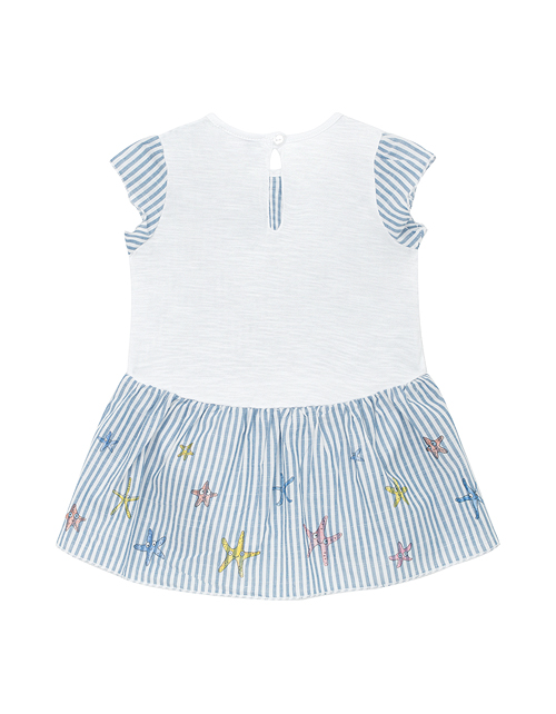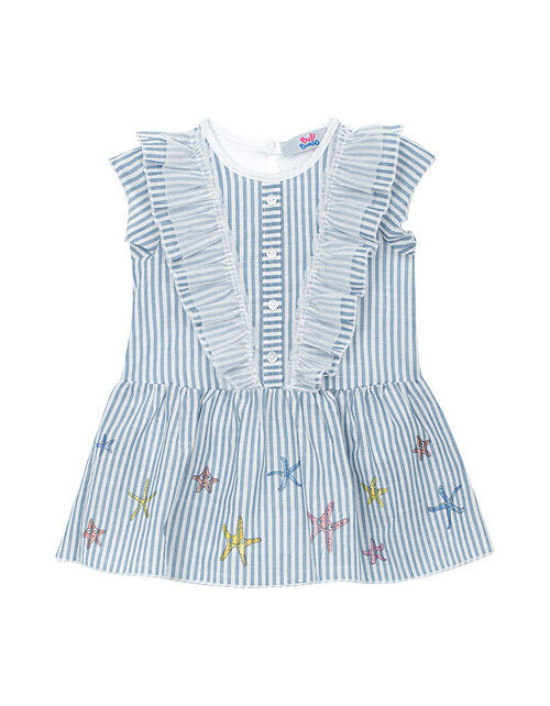 Чудесный полукомбинезон для маленькой принцессы. Образ складывается из привлекательного силуэта: верха, отделанного V-образным декором из рюш, и низа с легкой воздушной юбкой. Приятная натуральная ткань в полоску декорирована принтом с морскими звездами
