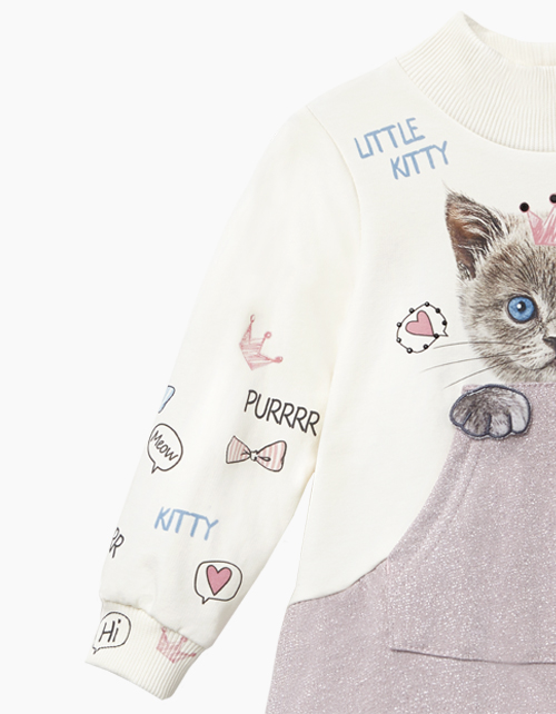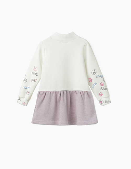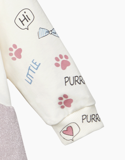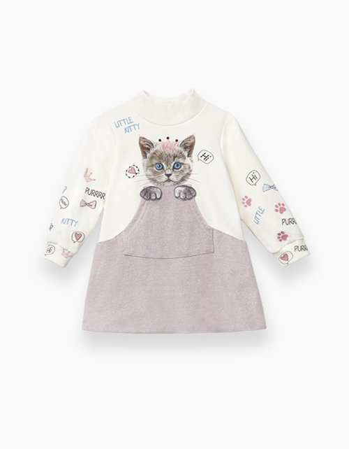 Платье из двухниточного футера разных цветов и фактур с присобранной юбкой. Декор из принтов и страз. Над карманом-кенгуру спереди - изображение котика в короне. Длинный рукав и горловина отделаны рибаной