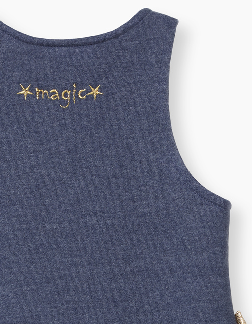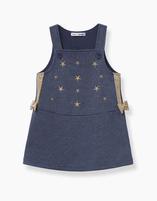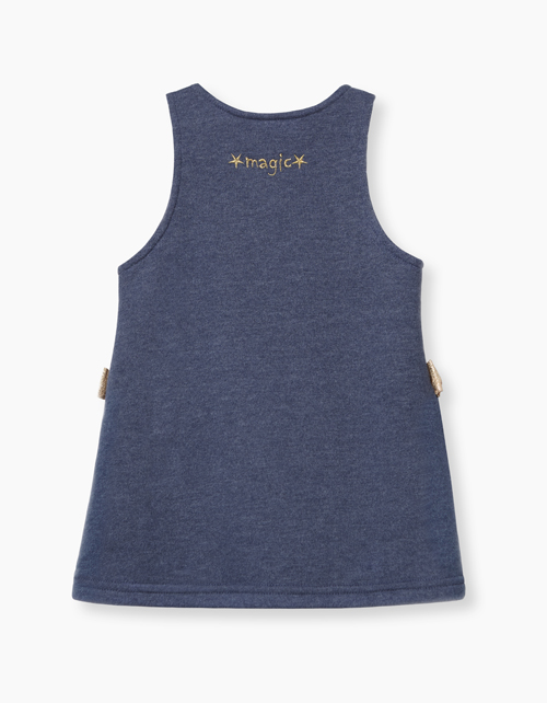 Сарафан А-силуэта из темно-синего меланжевого футера. Отделка золотой тесьмой по боковым швам лифа. Вышивка из золотых страз.