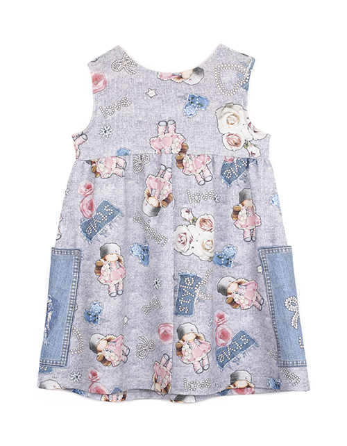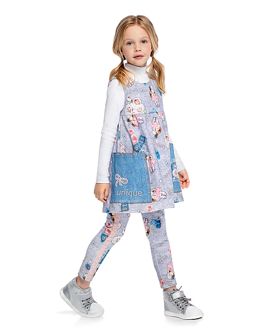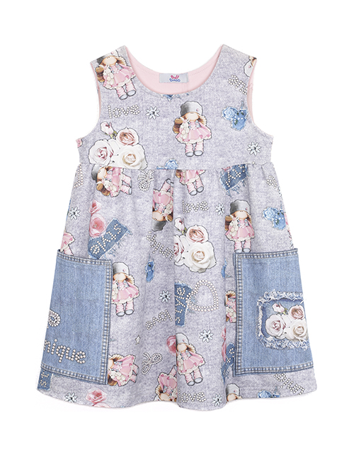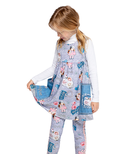 Сарафан для девочки с принтом свободного силуэта имеет завышенную линию талии и круглый вырез горловины. Изделие дополнено двумя накладными контрастными карманами с рисунком и декоративной строчкой. Ткань футер гарантирует приятные тактильные ощущения.