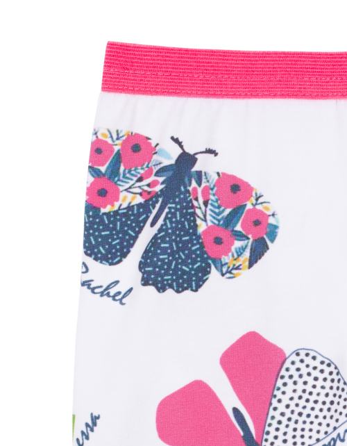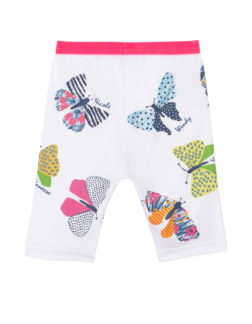 Белые бриджи для девочки на резинке. Принты тематики "Вальс бабочек" по всему полотну изделия.