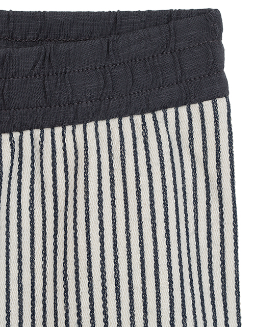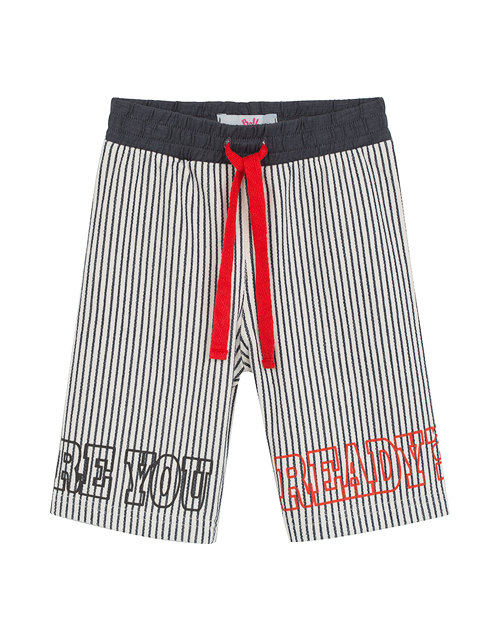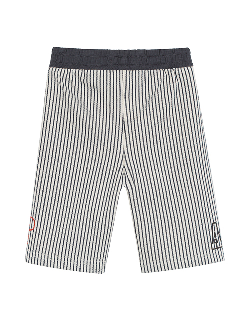Комфортные бриджи в полоску просто необходимы малышу жарким летом! Активному ребенку понравится приятный натуральный материал и свободная форма модели. Модные акценты - принты-надписи и яркий шнурок-пояс - делают изделие особенно стильным
