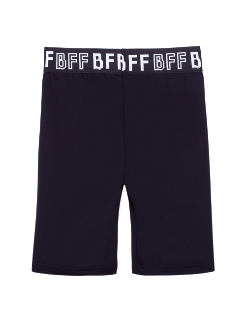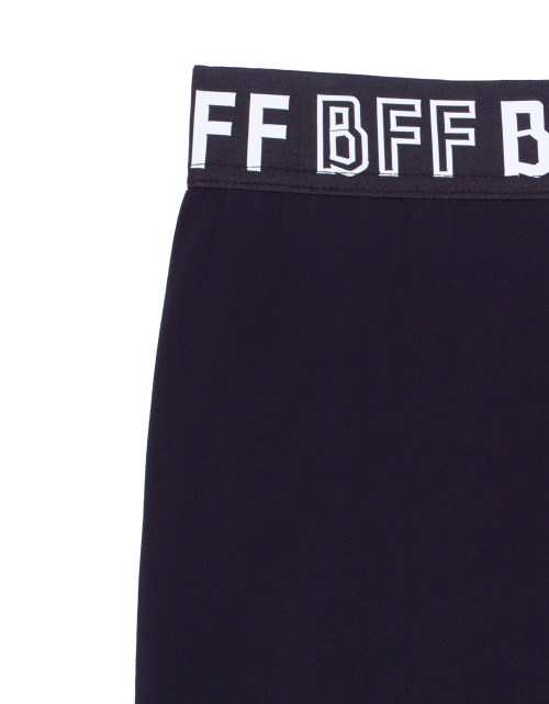 Черные шорты для девочки прилегающего силуэта длиной до середины бедра на мягком поясе из эластичной ленты. Принт-надпись в стилистике капсулы "Кот-арт".